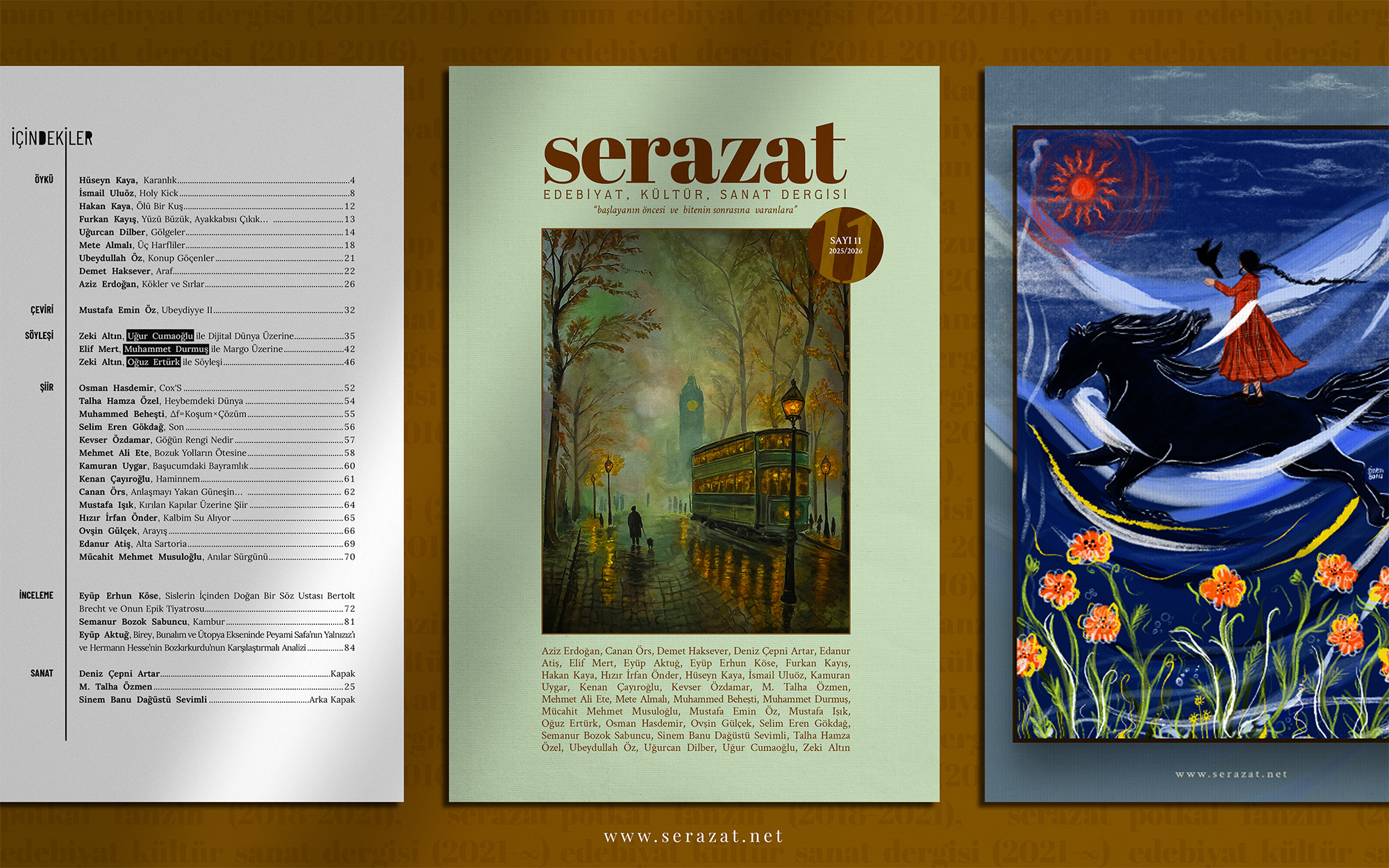 Serazat Edebiyat, Kültür, Sanat Dergisi, dolu dolu içeriğiyle merakla beklenen 11. sayısı (Yıl: 4, 2025/2026) ile okurlarıyla buluşuyor. Edebiyatın farklı dallarından eserleri bir araya getiren bu sayı, derinlikli incelemelerden çarpıcı öykülere, güncel söyleşilerden yeni şiirlere kadar zengin bir okuma deneyimi sunuyor.